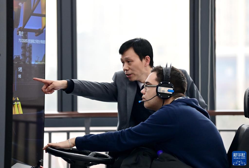 2月17日,在西鐵教育培訓基地,西安交通大學(xué)的羅馬尼亞留學(xué)生(前)在貨裝實(shí)訓室體驗模擬駕駛。