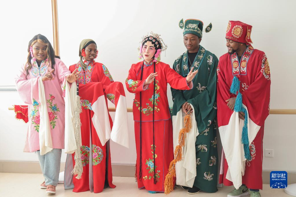 2月17日,在山東省臨沂市蘭山區棗園鎮弦子戲非遺展廳,當地非遺傳承人劉妮(左三)指導留學(xué)生體驗唱弦子戲。