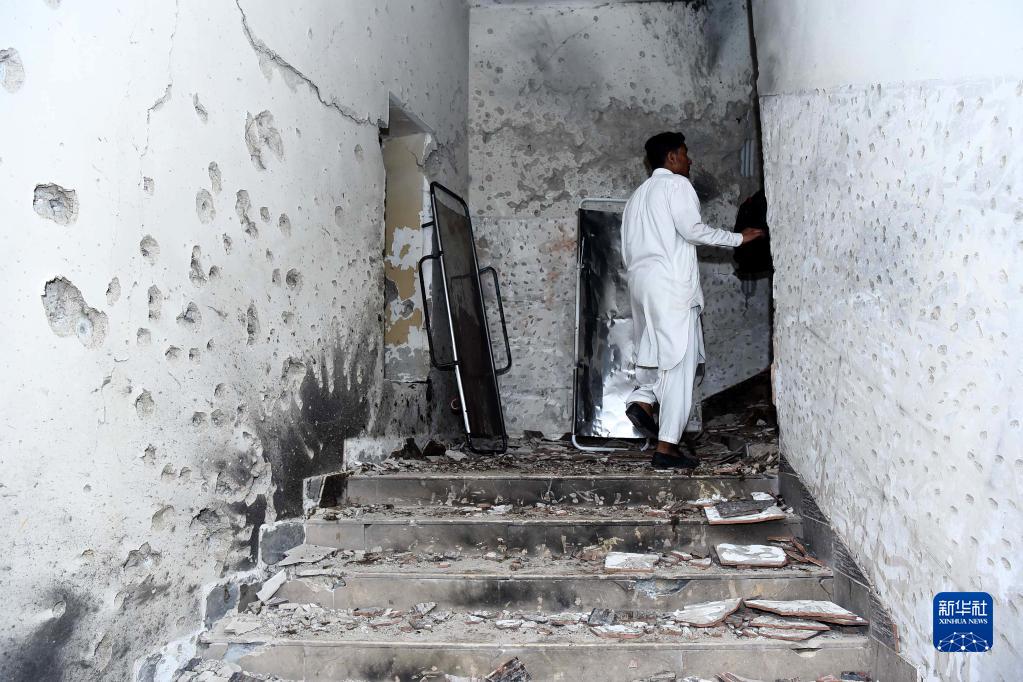這是2月17日在巴基斯坦卡拉奇拍攝的遇襲警察局的建筑內部。