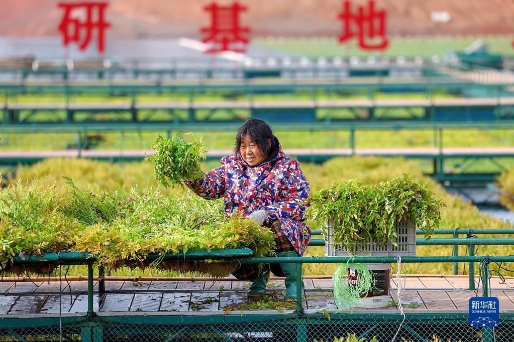 2月17日,浙江省杭州市淳安縣千島湖鎮坪山生態(tài)浮島上,工作人員忙著(zhù)采摘水生蔬菜。