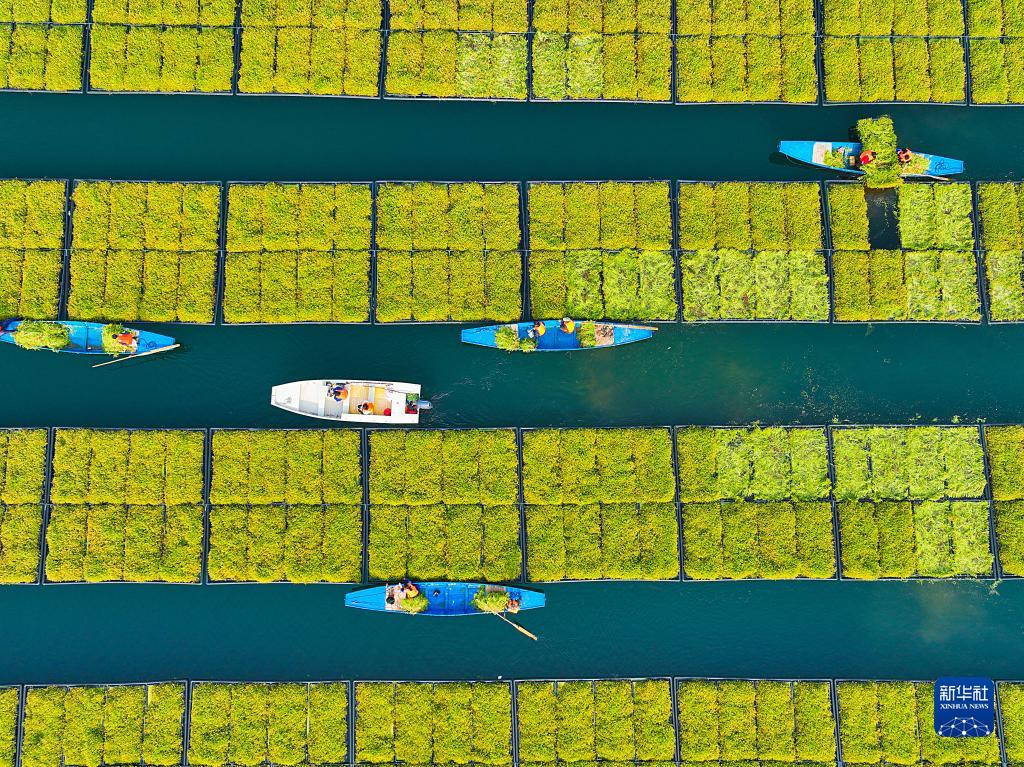 近年來(lái),浙江省杭州市淳安縣在千島湖典型庫灣、入湖口等區域,積極運用生態(tài)浮島水上植物無(wú)土栽培技術(shù)種植空心菜、水芹菜等水生蔬菜,直接吸收庫區水體中氮磷等元素,從而能夠有效地降低水體中營(yíng)養物質(zhì)的含量,提升水質(zhì)。近日,水生蔬菜進(jìn)入采收季節,“湖上菜園”呈現春收繁忙景象。