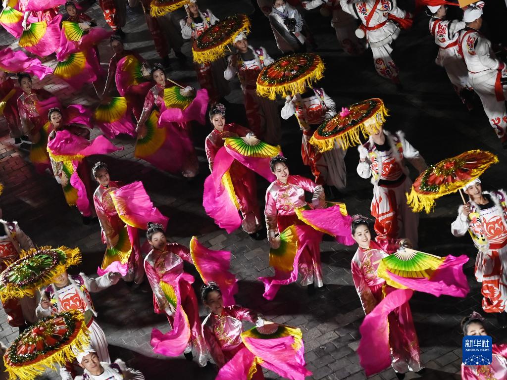 演員在榆林老街非遺大集開(kāi)集儀式上表演秧歌腰鼓(2月17日攝)。