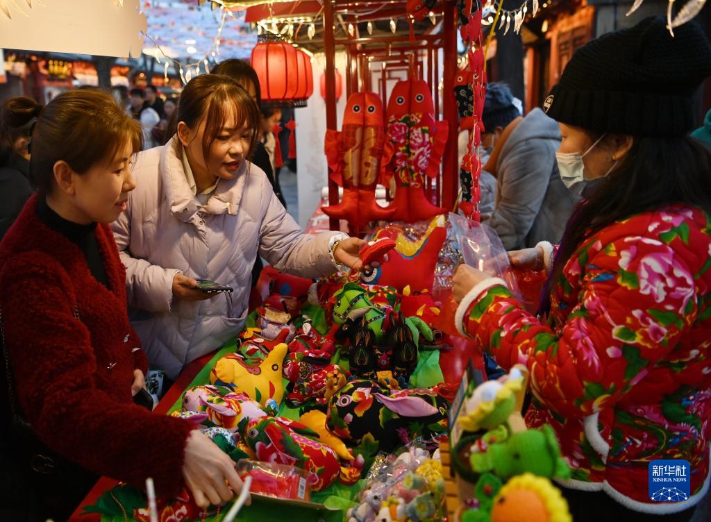 游客在非遺大集上購買(mǎi)濰縣布玩具(2月17日攝)。