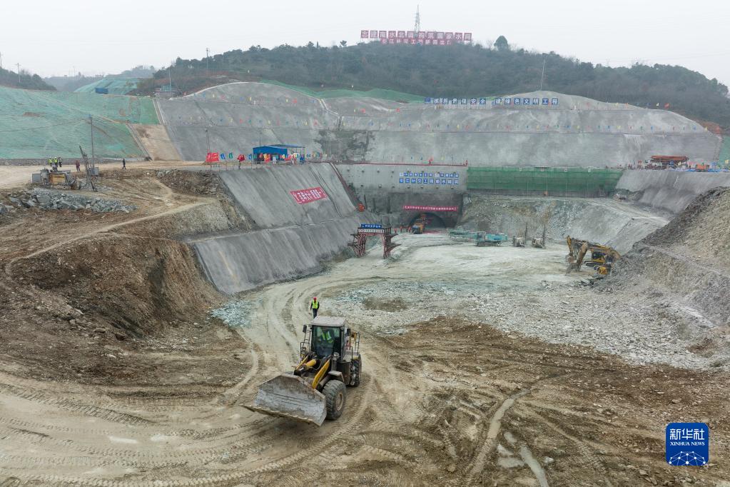 2月18日拍攝的引江補漢工程主體隧洞施工現場(chǎng)(無(wú)人機照片)。