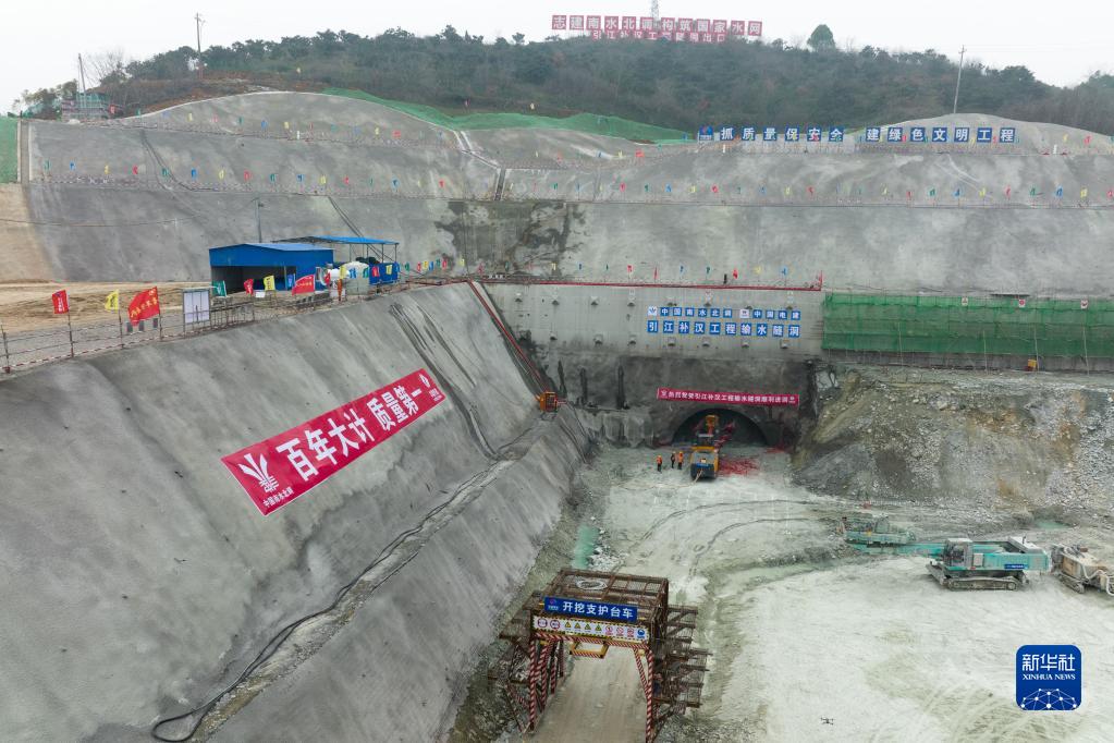 2月18日拍攝的引江補漢工程主體隧洞施工現場(chǎng)(無(wú)人機照片)。