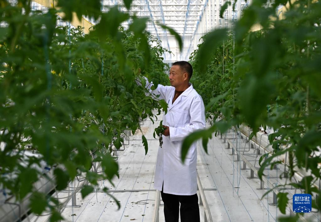 在蘭考縣儀封鎮水木焦桐都市農業(yè)綜合體項目車(chē)間里,技術(shù)人員在查看番茄苗長(cháng)勢(2月16日攝)。