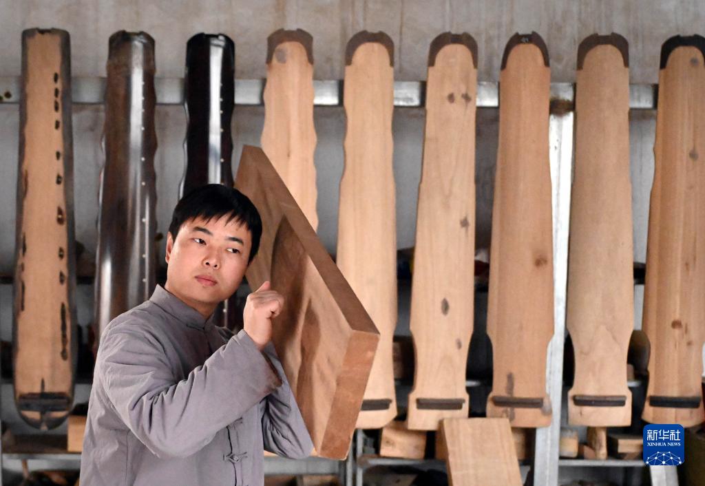 在蘭考縣堌陽(yáng)鎮徐場(chǎng)村墨武琴坊的古琴制作車(chē)間里,斫琴師徐亞沖通過(guò)叩擊判斷板材的質(zhì)量(2月16日攝)。