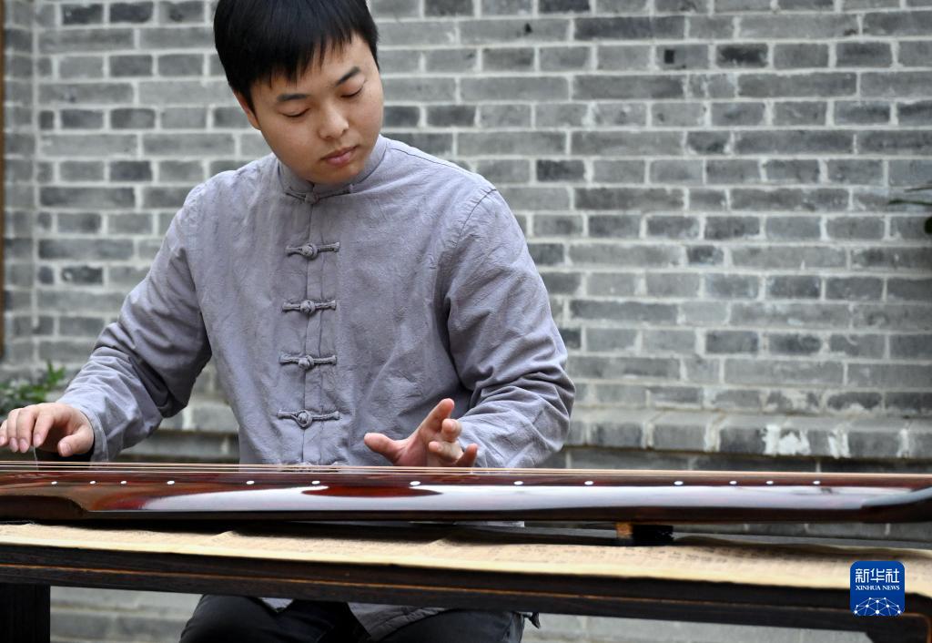 在蘭考縣堌陽(yáng)鎮徐場(chǎng)村墨武琴坊里,斫琴師徐亞沖在彈奏古琴(2月16日攝)。