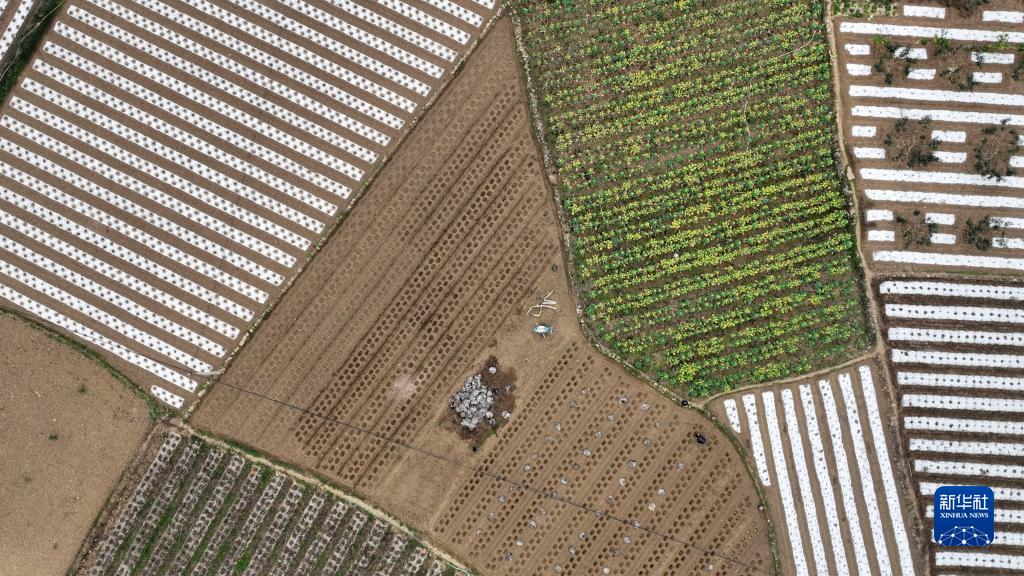 2月18日,村民在貴州省安順市關(guān)嶺布依族苗族自治縣斷橋鎮壩陵村早熟蔬菜基地勞作(無(wú)人機照片)。