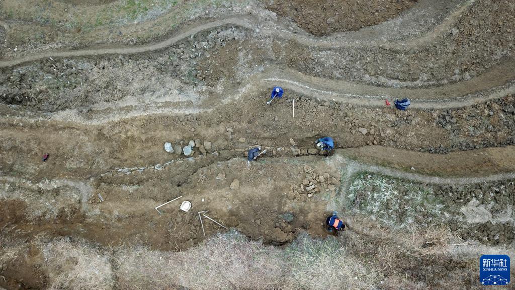 2月18日,村民在紫鵲界梯田夯實(shí)梯壁(無(wú)人機照片)。