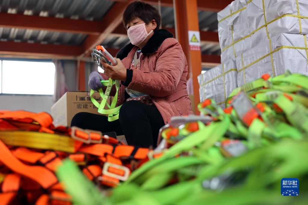 2月18日,山東省濱州市惠民縣姜樓鎮一家繩網(wǎng)企業(yè)工人在趕制一批來(lái)自國外的安全帶訂單。