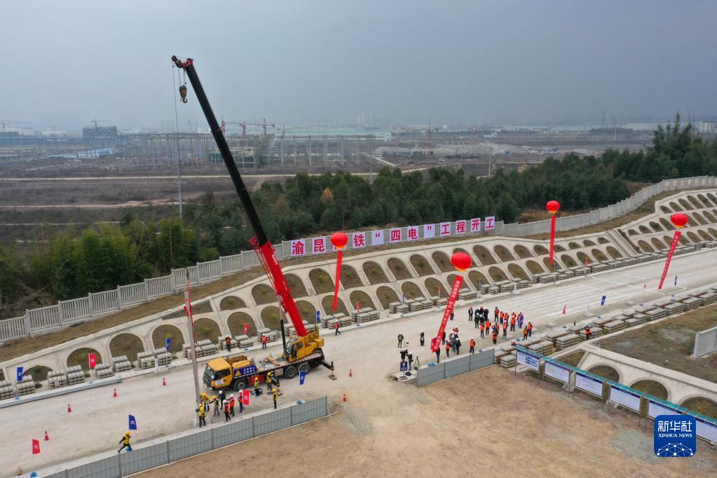 2月18日,在位于重慶市永川區的渝昆高鐵施工現場(chǎng),施工人員架設接觸網(wǎng)桿(無(wú)人機照片)。