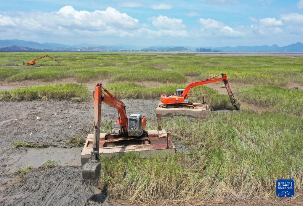 這是在寧德市蕉城區飛鸞鎮附近拍攝的互花米草整治現場(chǎng)(無(wú)人機照片,2022年8月24日攝)。