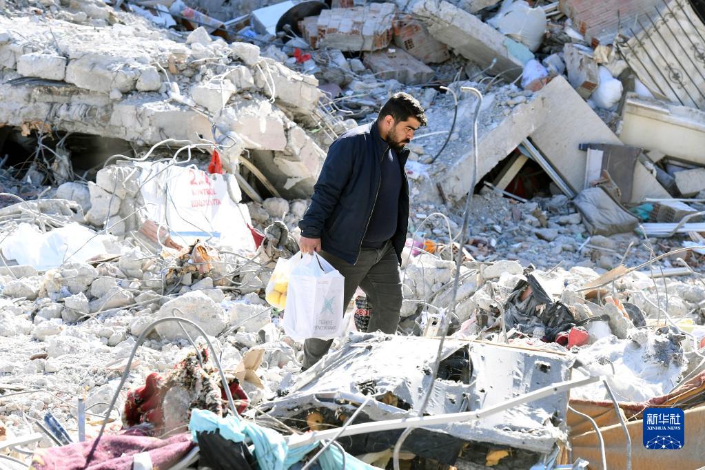 2月18日,在土耳其南部阿德亞曼省阿德亞曼市,一名男子站在一處建筑物廢墟中。