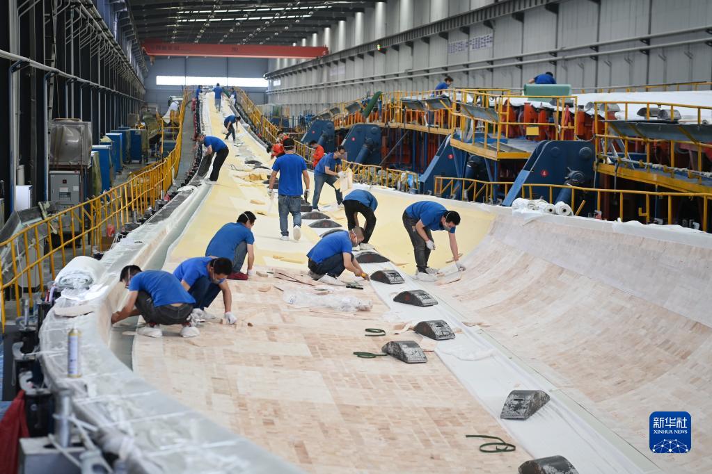 2月18日,在武威市涼州區一家風(fēng)電裝備生產(chǎn)企業(yè),工人在風(fēng)機葉片生產(chǎn)線(xiàn)上工作。