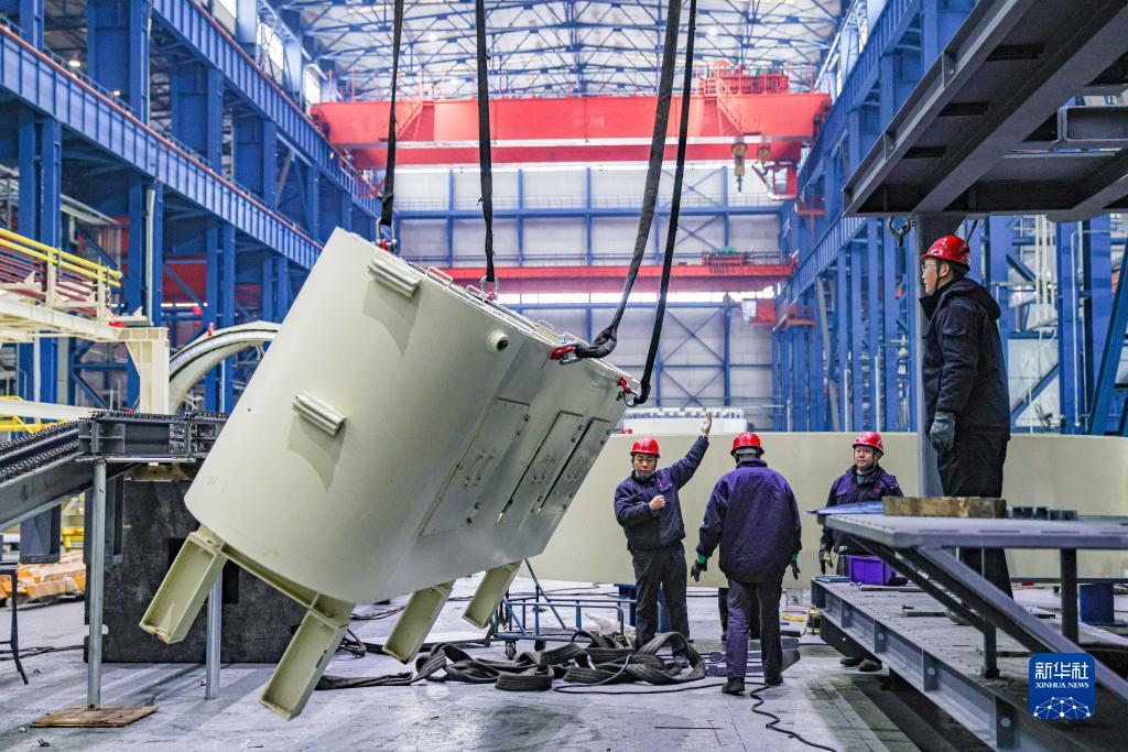 工人在位于遼寧省沈陽(yáng)市的北方重工有限公司車(chē)間吊裝設備(1月13日攝)。