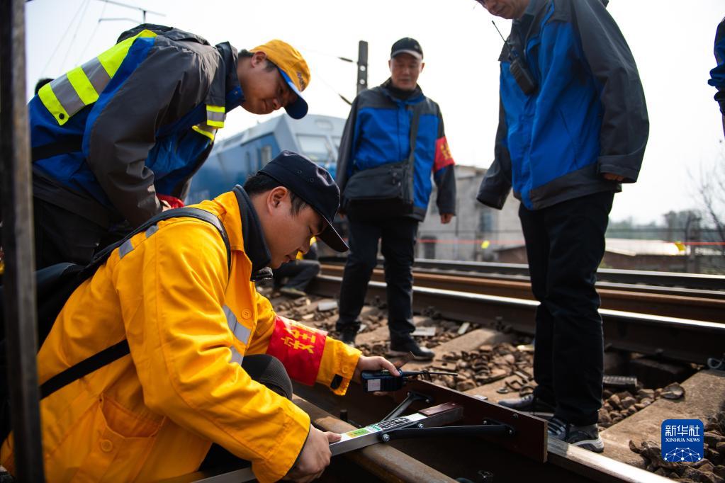 2月19日,在滬昆鐵路婁底至湘潭東區間,工人使用鐵路方尺給軌道定位。