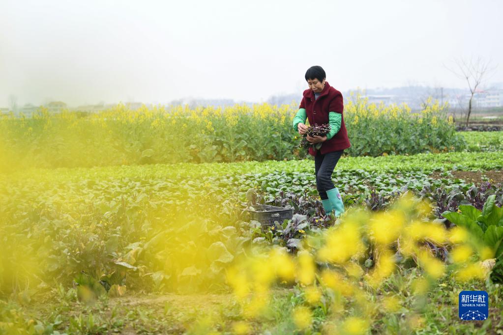 2月19日,湖南省常寧市三角塘鎮江南村農民在采收蔬菜。