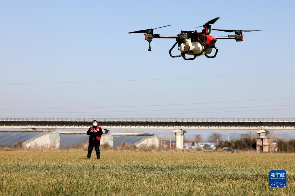 2月19日,在山東省棗莊市光明路街道丁莊村麥田里,農業(yè)技術(shù)員操作植保無(wú)人機給小麥噴施葉面肥。