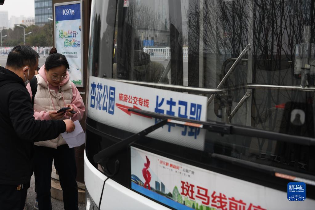 2月18日,工作人員(左)在查驗市民購買(mǎi)的“草莓采摘”定制公交專(zhuān)線(xiàn)電子票。