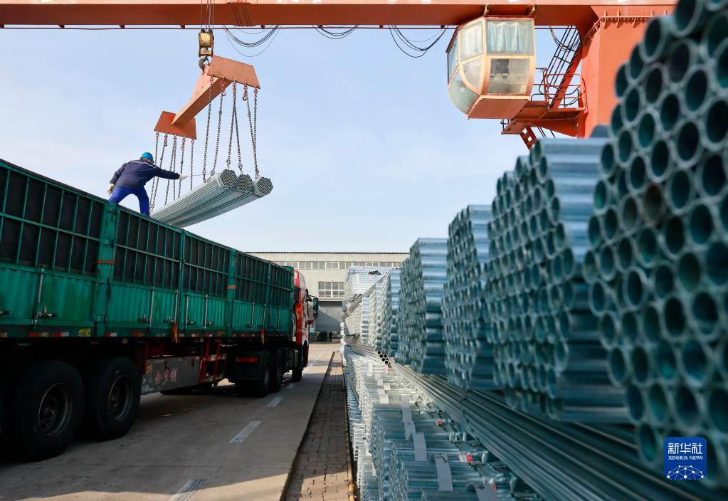 2月19日,工人在唐山市豐南區一家鍍鋅鋼管企業(yè)倉儲區操作設備吊裝鍍鋅鋼管。