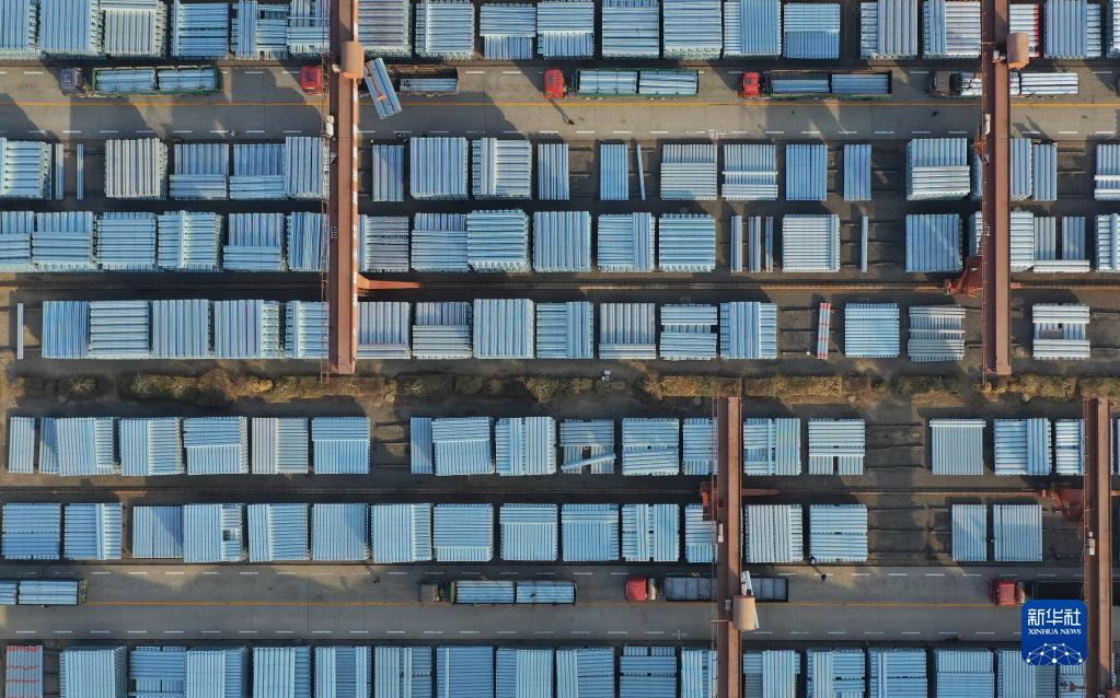 2月19日,工人在唐山市豐南區一家鍍鋅鋼管企業(yè)倉儲區操作設備吊裝鍍鋅鋼管(無(wú)人機照片)。