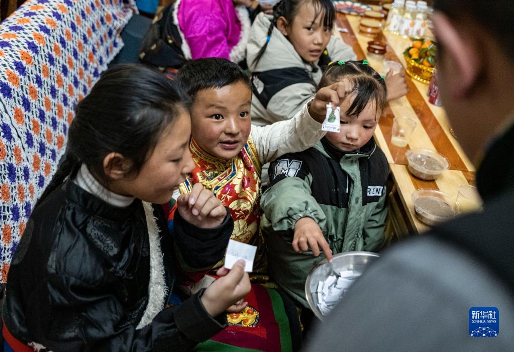 在位于森布日安置點(diǎn)的家中,石秀次仁家的孩子們在向家人展示自己隨機拿取的小紙條。畫(huà)在紙條上的圖案有著(zhù)不同的寓意(2月19日攝)。