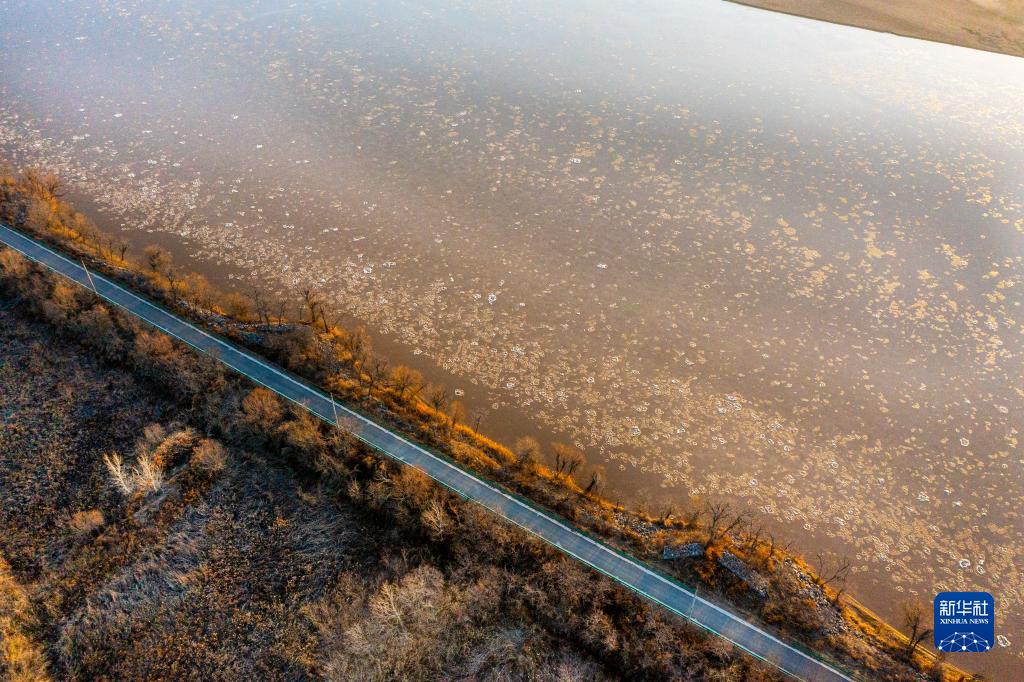 2月19日,在黃河流域的陜西省渭南市合陽(yáng)段拍攝的黃河冰凌漂流美景(無(wú)人機照片)。