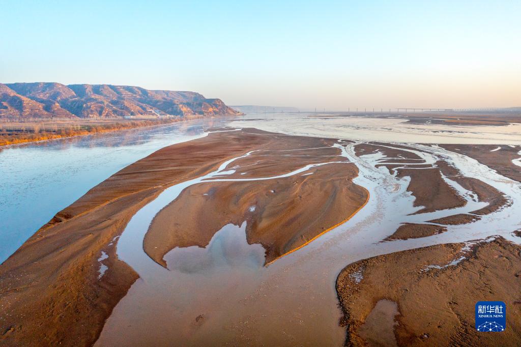2月19日,在黃河流域的陜西省渭南市合陽(yáng)段拍攝的黃河灘涂美景(無(wú)人機照片)。