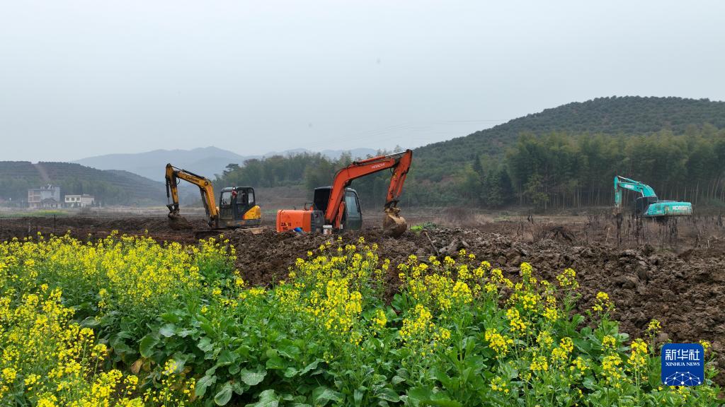 2月19日,施工人員在常寧市三角塘鎮塘沖村高標準農田建設現場(chǎng)施工(無(wú)人機照片)。
