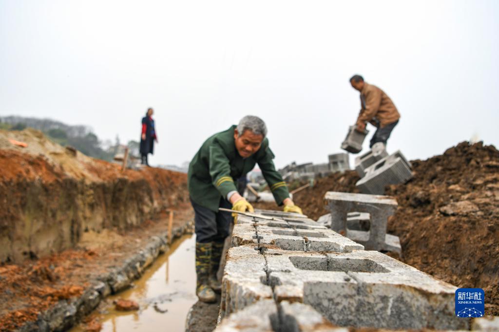 2月19日,施工人員在常寧市三角塘鎮塘沖村高標準農田建設現場(chǎng)修建排水渠。
