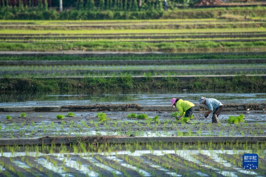 2月19日,海南省瓊海市嘉積鎮農民在地里插秧。