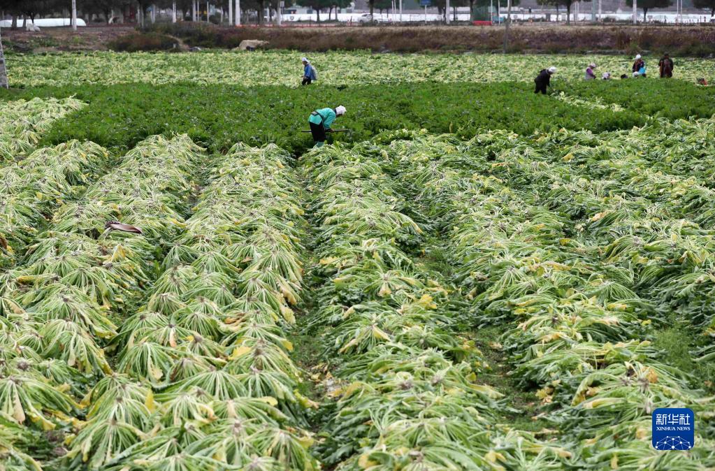 2月19日,村民在貴州省黔東南苗族侗族自治州榕江縣古州鎮車(chē)江大壩采收雪里蕻。
