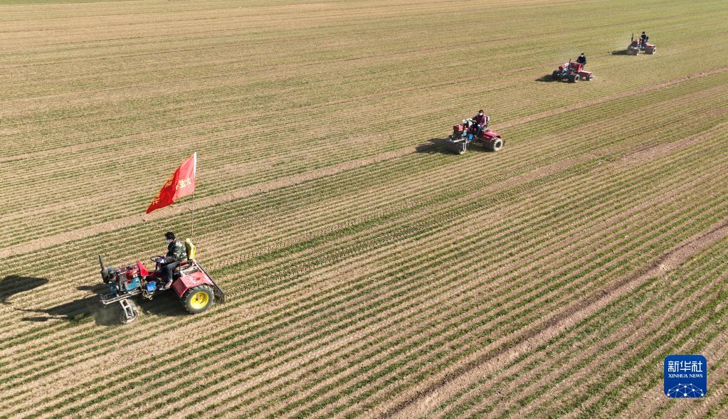 2月20日,在山東省聊城市茌平區馮官屯鎮東封村,大龍農機合作社的操作手在小麥地里作業(yè)(無(wú)人機照片)。
