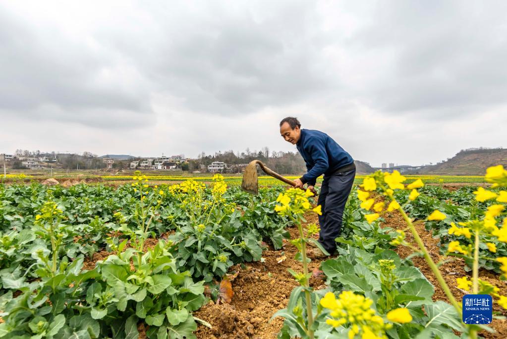 2月19日,村民在貴州省黔西市錦繡街道新民社區的油菜地里套種玉米。
