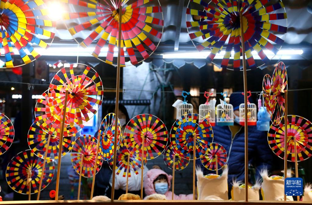 2月19日晚,游客在即墨古城選購風(fēng)車(chē)。