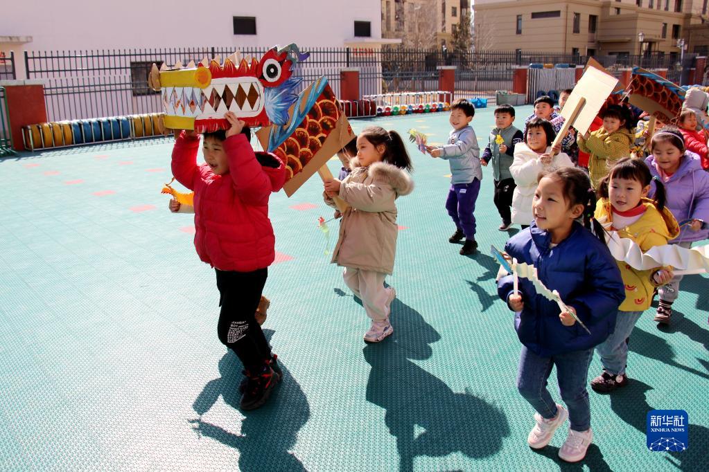2月20日,山東省青島西海岸新區膠南中心幼兒園的小朋友在“二月二 龍抬頭”主題活動(dòng)中用自制的道具舞龍。