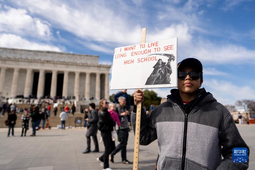 2月19日,在美國首都華盛頓,一名青少年手舉標語(yǔ)在林肯紀念堂前參加集會(huì )。