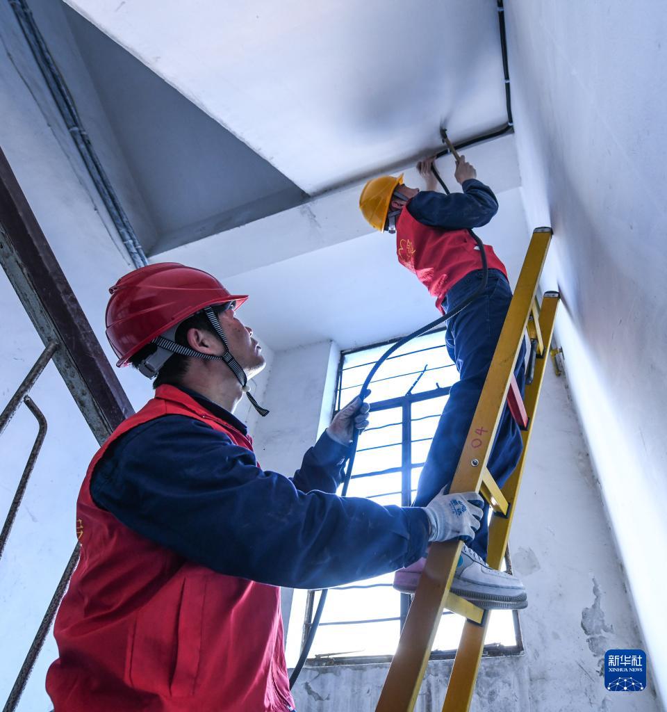 2月20日,在余姚市古建小區,余姚市大城小愛(ài)公益服務(wù)中心的志愿者在樓道內安裝線(xiàn)路。