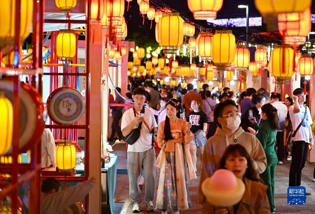 游客在??谌赵聫V場(chǎng)逛古風(fēng)市集(2月19日攝)。
