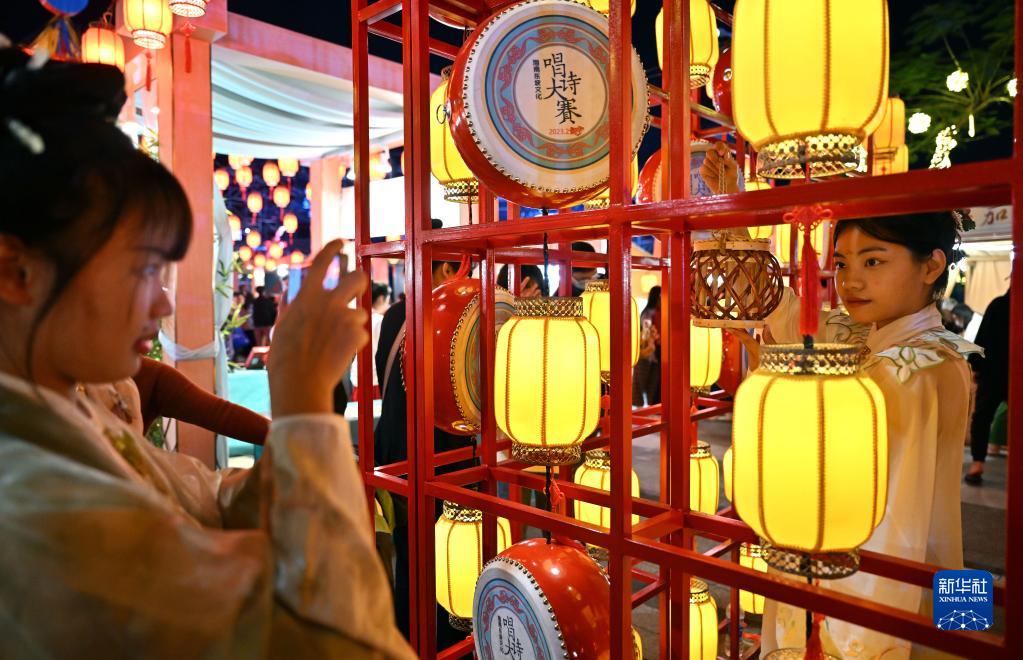 游客在??谌赵聫V場(chǎng)的古風(fēng)市集拍照留念(2月19日攝)。