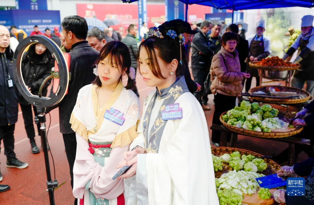 2月20日,在第五屆中國重慶·涪陵榨菜產(chǎn)業(yè)國際博覽會(huì )現場(chǎng),網(wǎng)絡(luò )主播進(jìn)行線(xiàn)上直播推介涪陵榨菜。