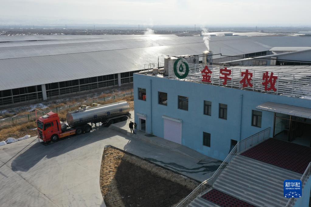 在武威市古浪縣生態(tài)奶牛產(chǎn)業(yè)園的一家企業(yè)牧場(chǎng),工作人員準備使用運奶車(chē)轉運鮮牛奶(2月16日攝,無(wú)人機照片)。