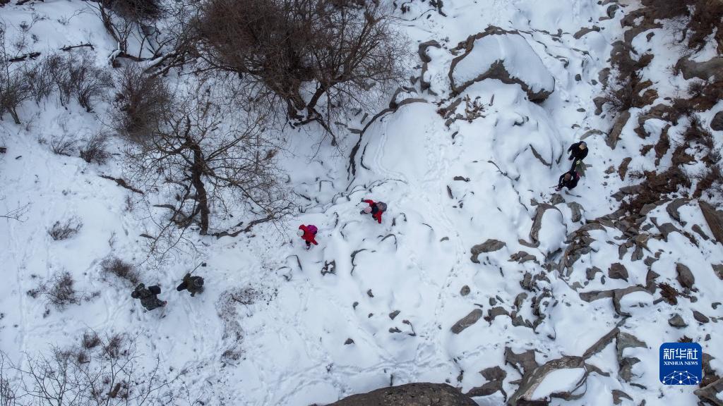 2月20日,在內蒙古賀蘭山國家級自然保護區,工作人員在山間跋涉(無(wú)人機照片)。