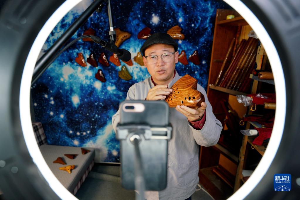 2月20日,陶笛藝人侯義敏在直播中講解木質(zhì)陶笛的相關(guān)知識。