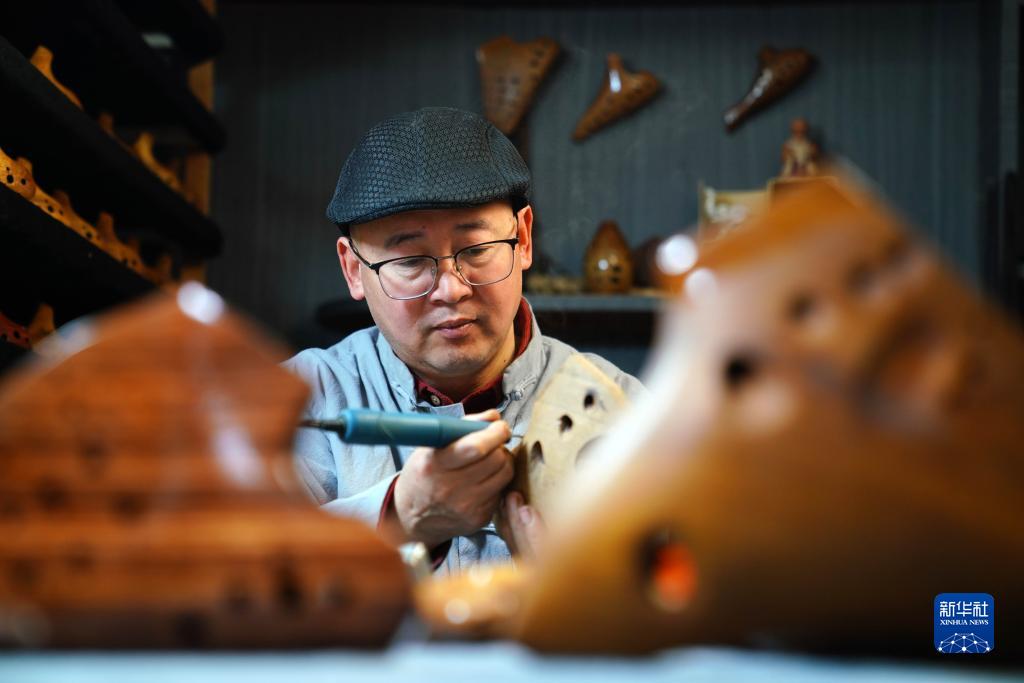 2月20日,陶笛藝人侯義敏在制作木質(zhì)陶笛。