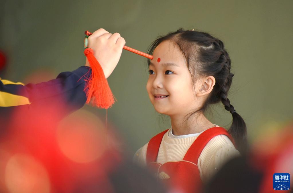 2月21日,山東省淄博市沂源縣南麻街道中心幼兒園的老師為小朋友點(diǎn)砂啟智。