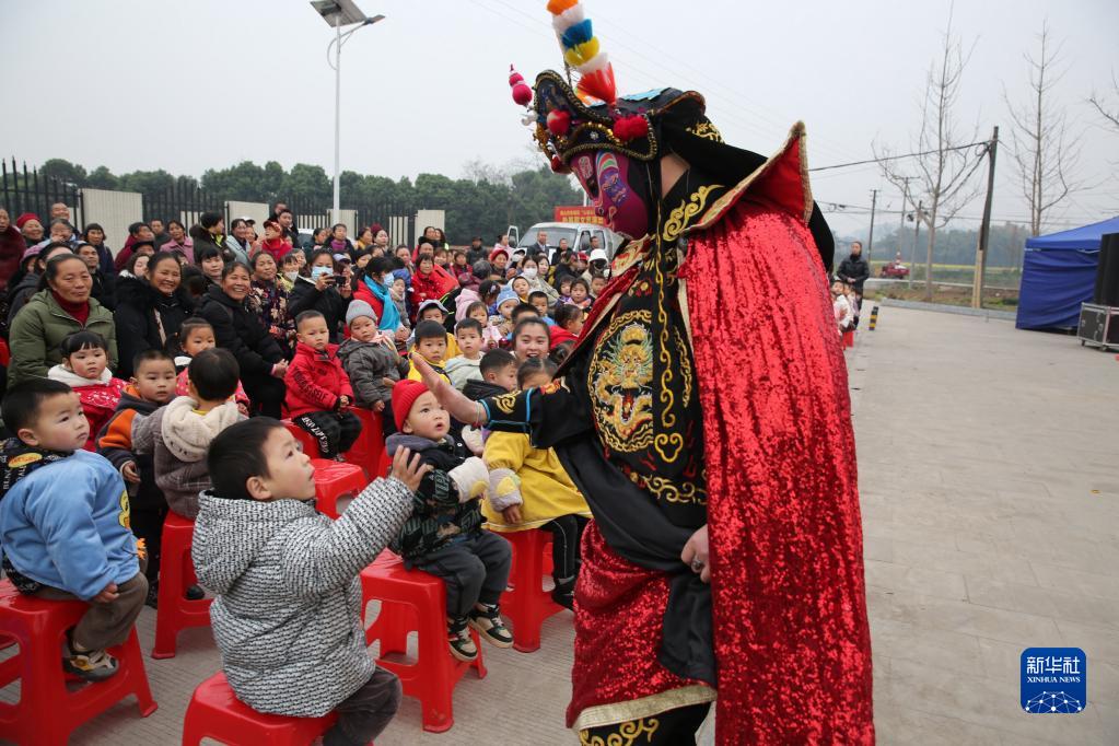 2月21日,四川眉山市東坡區心連心藝術(shù)團演員在崇禮鎮復盛社區表演川劇絕活“變臉”,并與現場(chǎng)觀(guān)眾互動(dòng)。