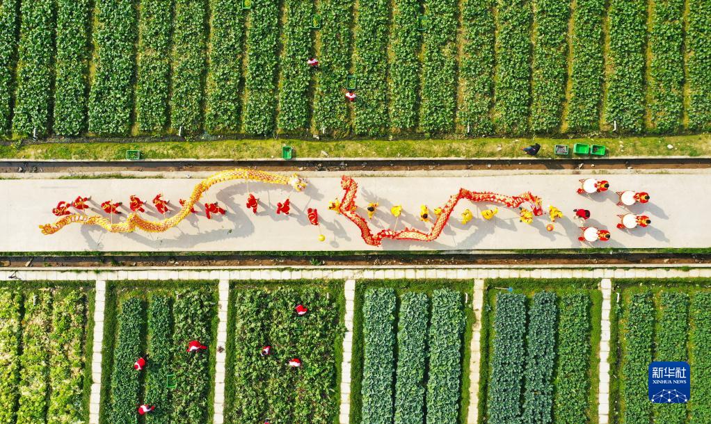 2月21日,湖南省永州市新田縣蓮花學(xué)校的孩子們在縣東升農場(chǎng)勞動(dòng)實(shí)踐基地田野間進(jìn)行舞龍表演(無(wú)人機照片)。