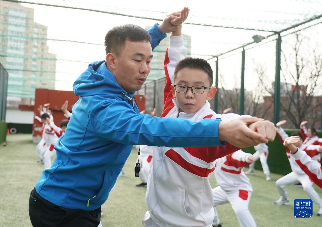 2月21日,在人大附中實(shí)驗小學(xué),體育教師甄野(左)在體育課中指導學(xué)生進(jìn)行武術(shù)練習。